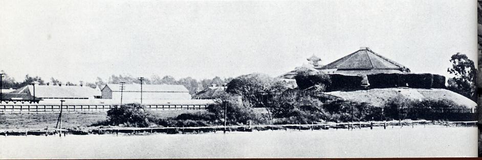 atop a shell mound that reaches down to the edge of the bay. In background is