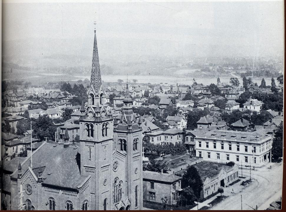 church with towering steeple is the First Presbyterian that stood at 14th and