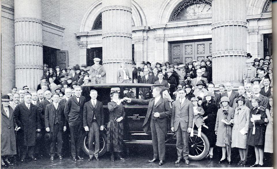 Rev. Edgar Allan Lowther was pastor at First Church in 1925. It had been 63 years since Methodism had invaded Oakland and the city had grown from 1,550 residents to a population of 300,000. Our story indicates that First Church had kept pace. The church began with 15 members in 1862 and now boasted 1,550 members. Besides it had 1,300 in Sunday School, and property valued at $300,000.