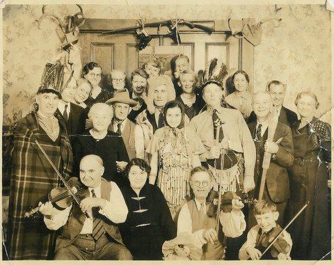 My grandfather, Mark L. Burns is in the front row on the far left playing the violin. My mother is the "squaw" in the middle - she was around 14 at the time, so it was taken around 1933 - she's 86 now and can't remember any of the people in the picture other than Carl Lamus who is in the headdress and is standing next to her.
