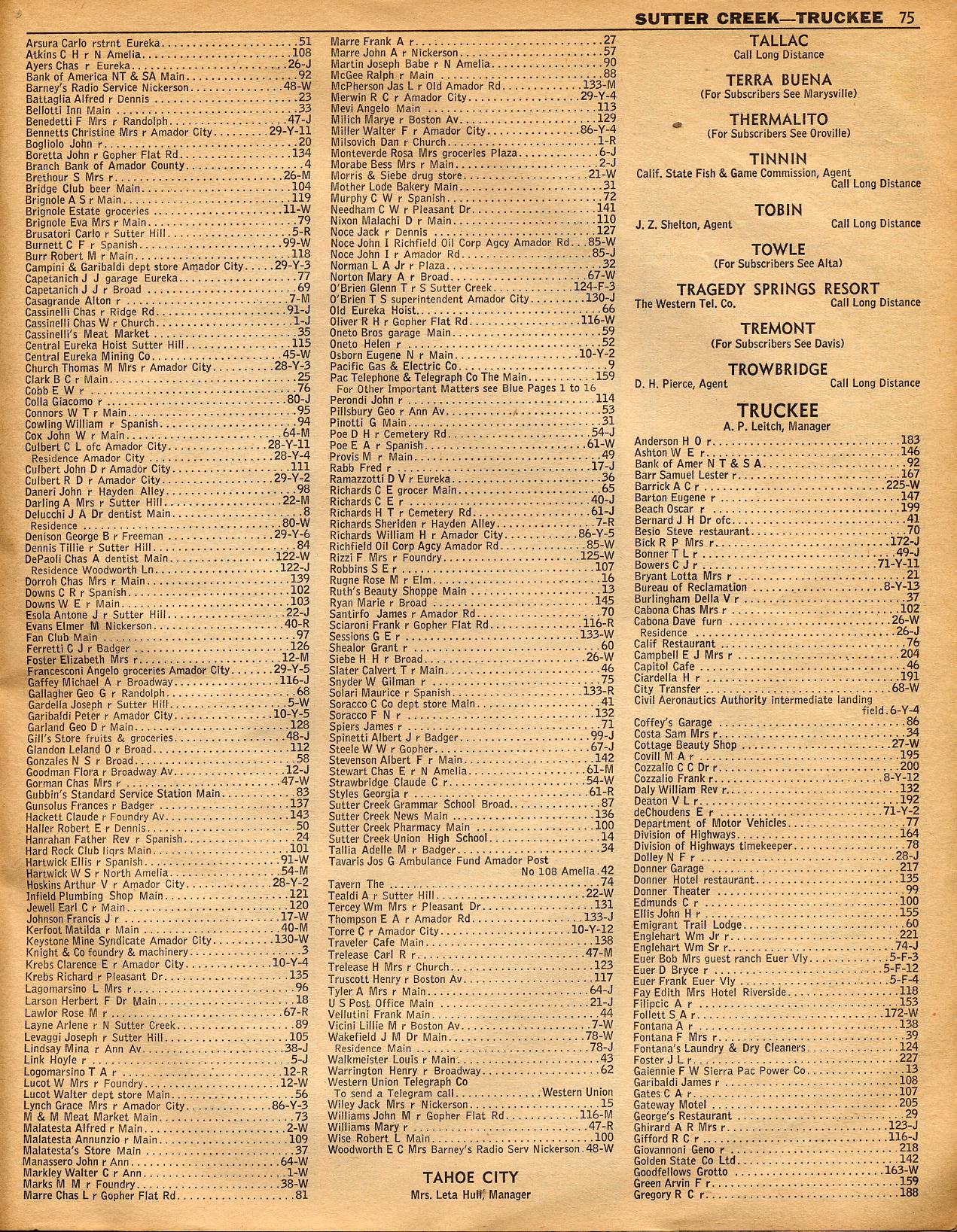 | 71 | | 72 | | 73 | | 74 | | 75 |TAHOE CITY, TALLAC, TERRA BUENA, THERMALITO, TINNIN, TOBIN, TOWLE, TRAGEDY SPRINGS RESORT, TREMONT TROWBRIDGE, TRUCKEE, TUDOR, TWAIN, TWIN BRIDGES, TWIN CITIES