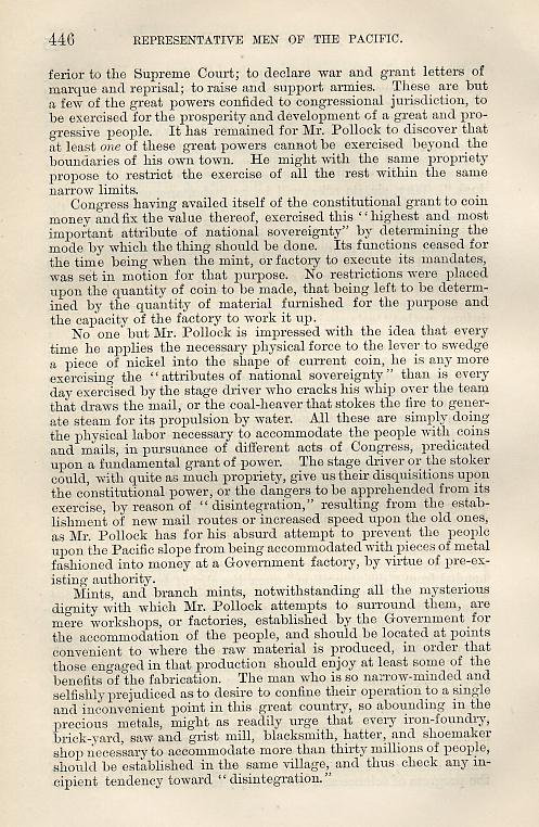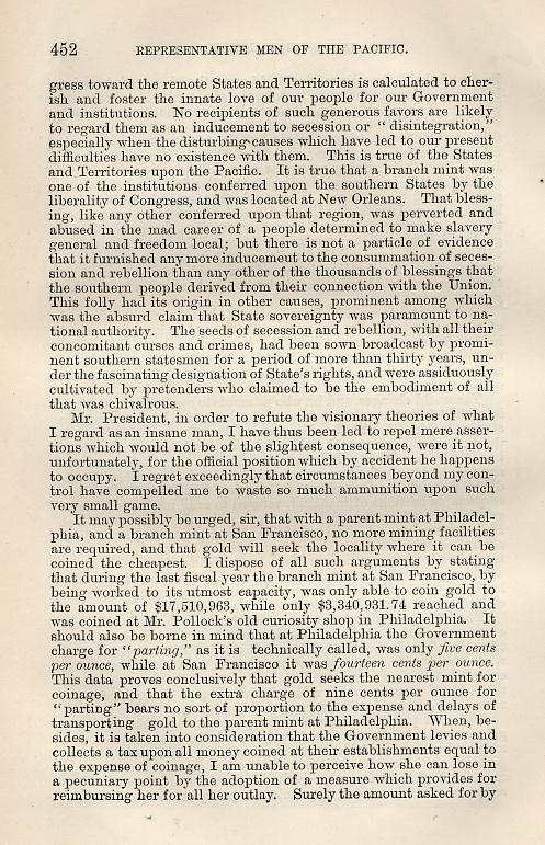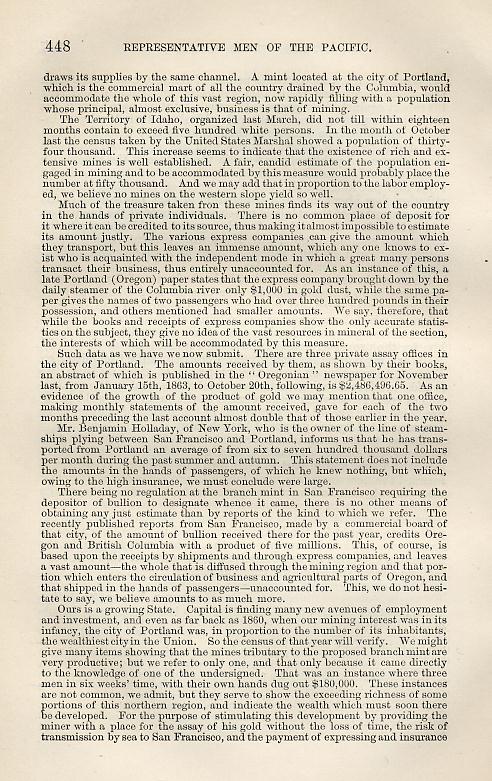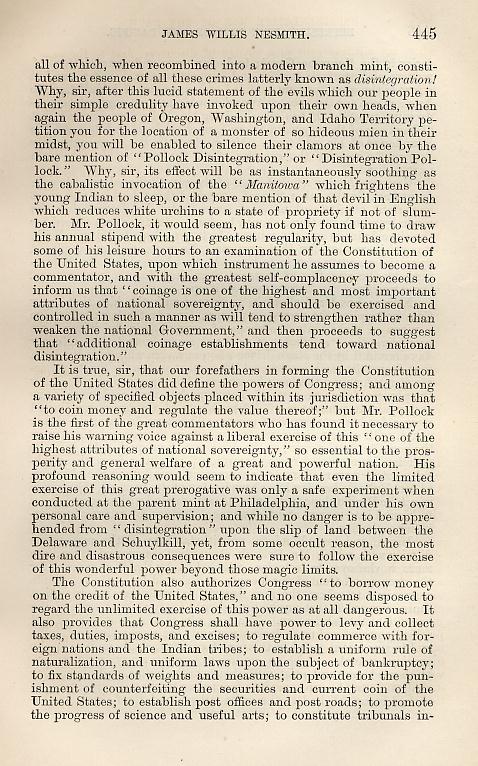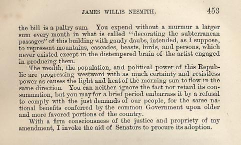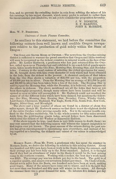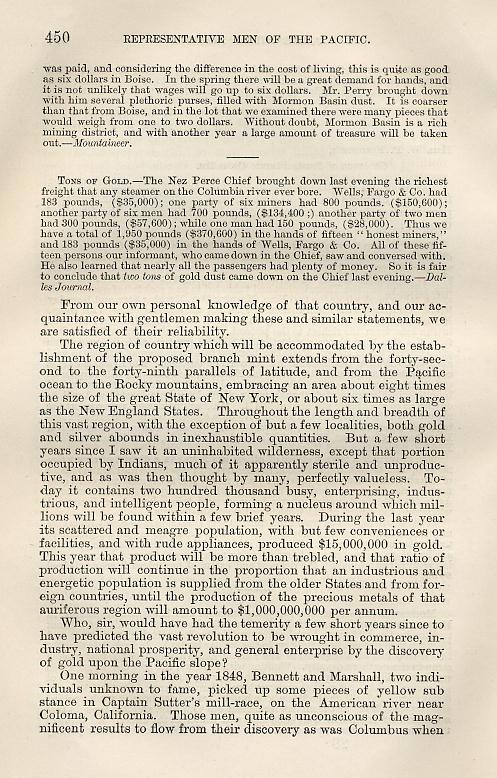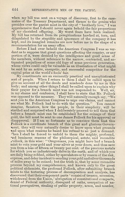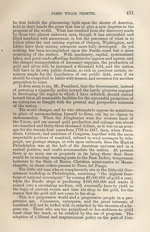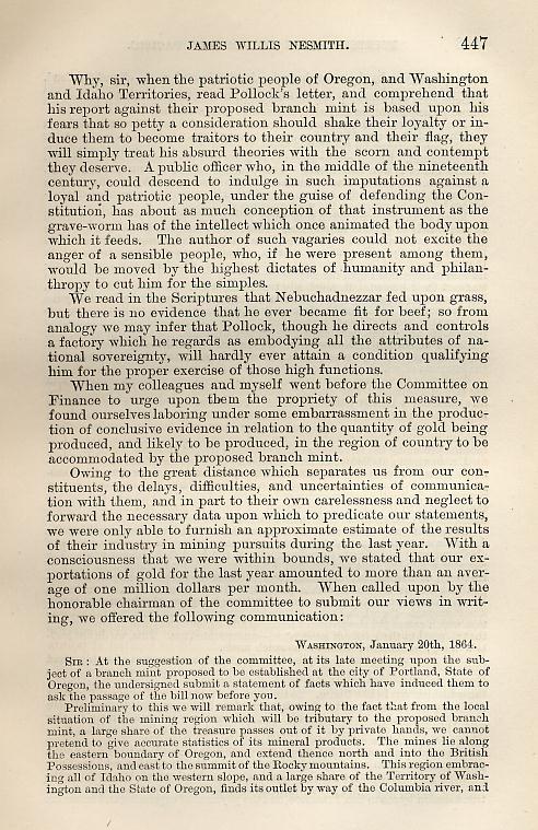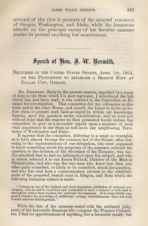 Mr. Nesmith is an earnest and forcible, though not an eloquent speaker. He never wearies his auditors, and has no difficulty in engaging their attention, no matter to what subject he addresses himself. His bold, plain and emphatic utterances carry the conviction that he is a practical and truthful man. He is a devoted son of the State where he has so long lived, and his popularity is very great throughout the new north-west. The speech which follows this sketch, in which he urged upon Congress the necessity of establishing a branch of the United States Mint at Dalles City, Oregon, will be found interesting on account of the view it presents of the mineral resources of Oregon, Washington, and Idaho, while his humorous attacks on the principal enemy of his favorite measure render its perusal anything but monotonous.