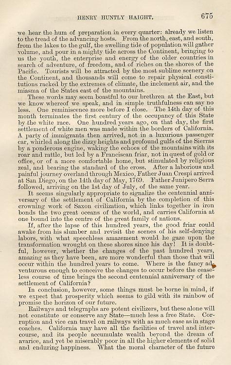 HENRY HUNTLY HAIGHT was born at Rochester, in the State of New York, May 20th, A. D. 1825. His ancestors were English on the paternal side, the first one who emigrated to America, Jonathan Teal Haight, having come to New York from England under the old Dutch régime. On the maternal side, he is descended from the old Scottish family or clan of Cameron, his great grandfather, Ewen Cameron—a cousin of the celebrated Lochiel—having come to New York from Scotland in 1790, and settled in the western part of the State. His Father, the late Fletcher M. Haight, a lawyer of eminence and distinguished ability, and who was at the time of his death, Judge of the United States District Court for the Southern District of California, was also a resident of western New York, where, with the exception of a few years in St. Louis, he lived until he removed to California in 1854.