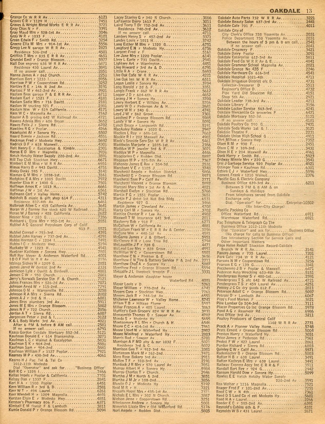 OAKDALE, OAKLAND RECREATION CAMP, OAKWOOD STOCK FARM, ORVIS, ORWOOD, O'SHAUGHNESSY DAM