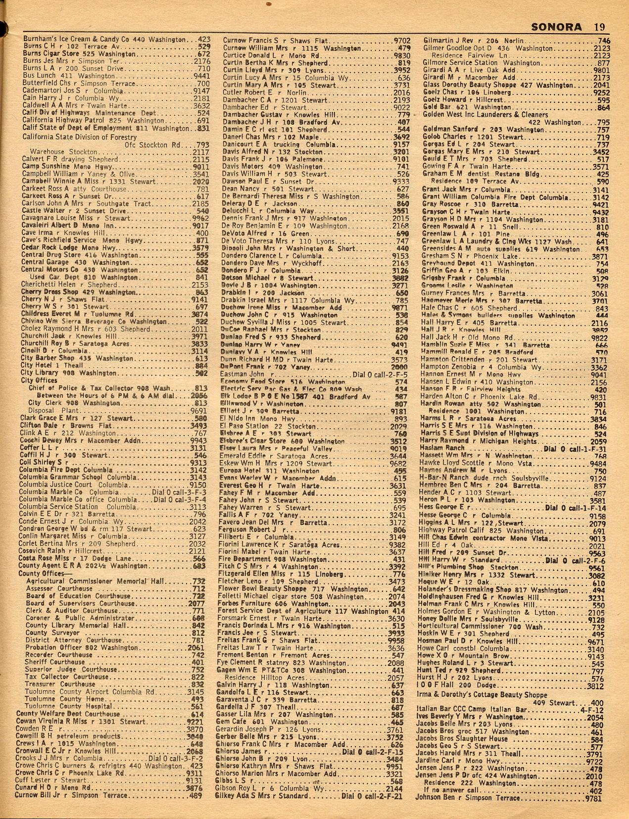 SALIDA, SAN ANDREAS, SAN JOAQUIN BRIDGE, SAN LUIS, SHAWMUT, SHEEP RANCH, SLIDE INN, SONORA, SOULSBYVILLE, SOUTH FORK, SPRINGS GAP, SPRINGFIELD MINE, STANDARD, STANISLAUS, STEVINSON, STRATTON, STRAWBERRY, STRAWBERRY DAM, SUGAR PINE, SYLVAN LODGE