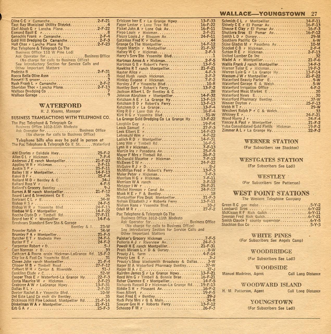 BANTA, BANTA JUNCTION,BELLOTA, BERKELEY RECREATION CAMP, BETHANY, BIG OAK FLAT, BLACKMORE, BRACK, BRET HARTE SANATORIUM, BUNDS, BURSON, CALAVERAS BIG TREES, CALAVERITAS, CAMP PARDEE, CAMPO SECO, CARL INN, CERES, CHINESE CAMP, CLEMENTS, CLIFF HOUSE, CLOUDMAN, COLD SPRINGS, COLUMBIA, COMANCHE, CONFIDENCE, COPPEROPOLIS, CROWMAIN, CROWS LANDING