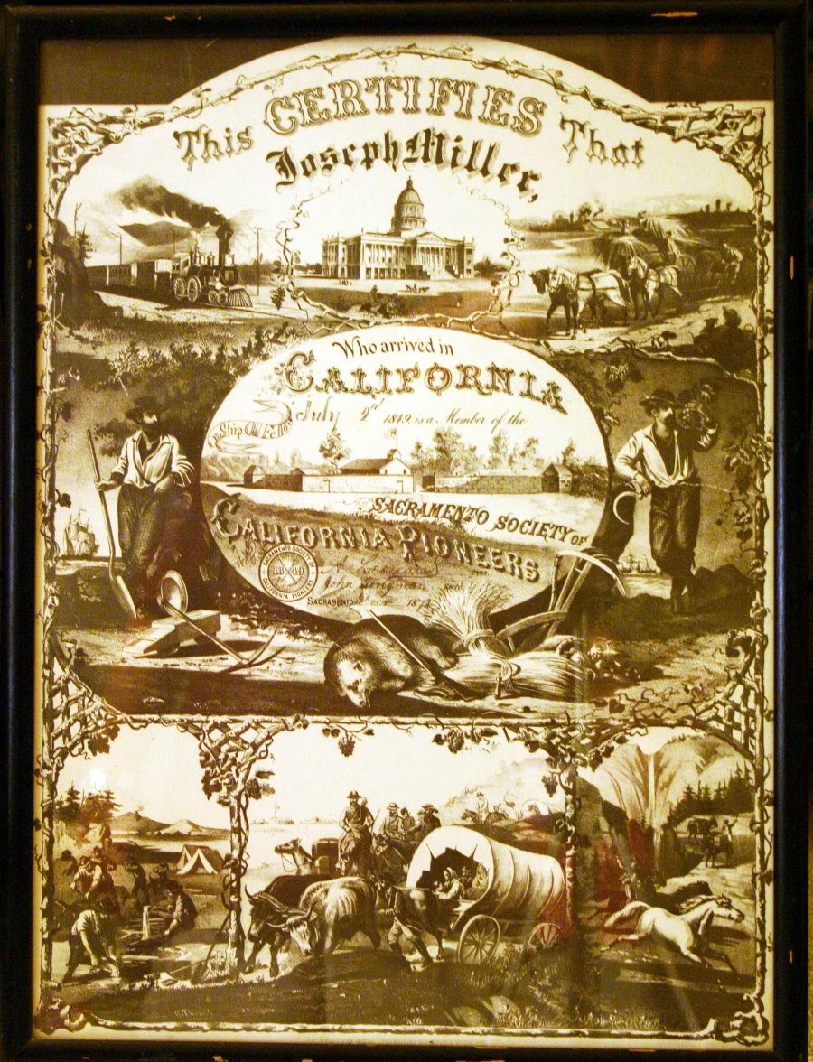 Joseph Miller's 1872 Sacramento Society of California Pioneers Certificate (Contact Elaine Martin if you are related.)