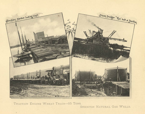 29/Photos (array of 4 on page)/ Stockton Harbor looking east; Steam Dredger “Thor”, built at Stockton; Traction Engine Wheat Train - 65 Tons; Stockton Natural Gas Wells