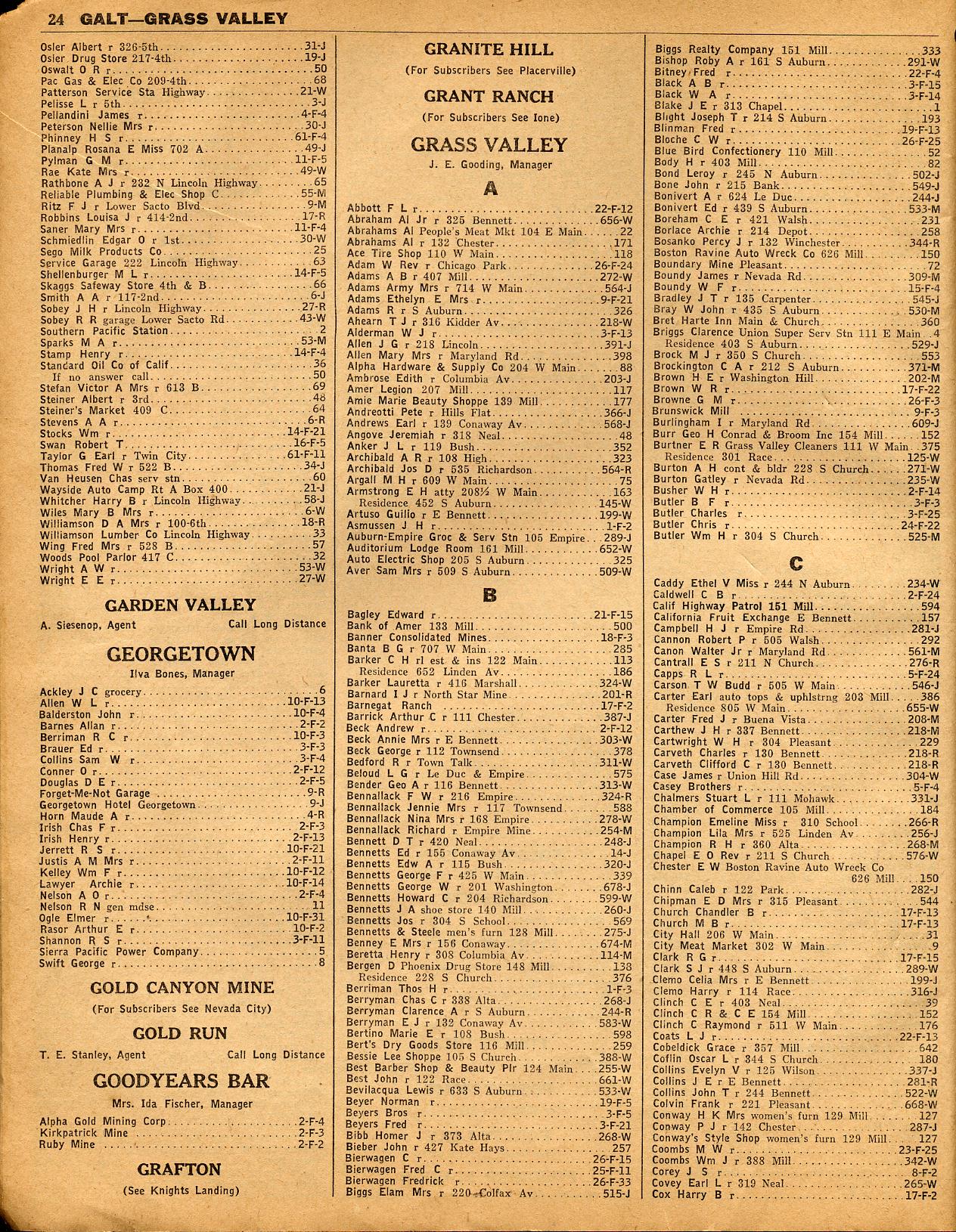 GALT, GARDEN VALLEY, GEORGETOWN, GOLD CANYON MINE, GOLD RUN, GOODYEARS BAR, GRAFTON, GRANITE HILL, GRANT RANCH, GRASS VALLEY, GRAYS FLAT, GREENWOOD, GRIDLEY, GRIZZLY FLAT, GUINDA, HAGGINWOOD, HAMMONTON, HANKS, HARTS MILL, HERALD, HOBART MILLS, HOMEWOOD, HONCUT, HOOD, HORGEN, HOWELLS, HURLETON,