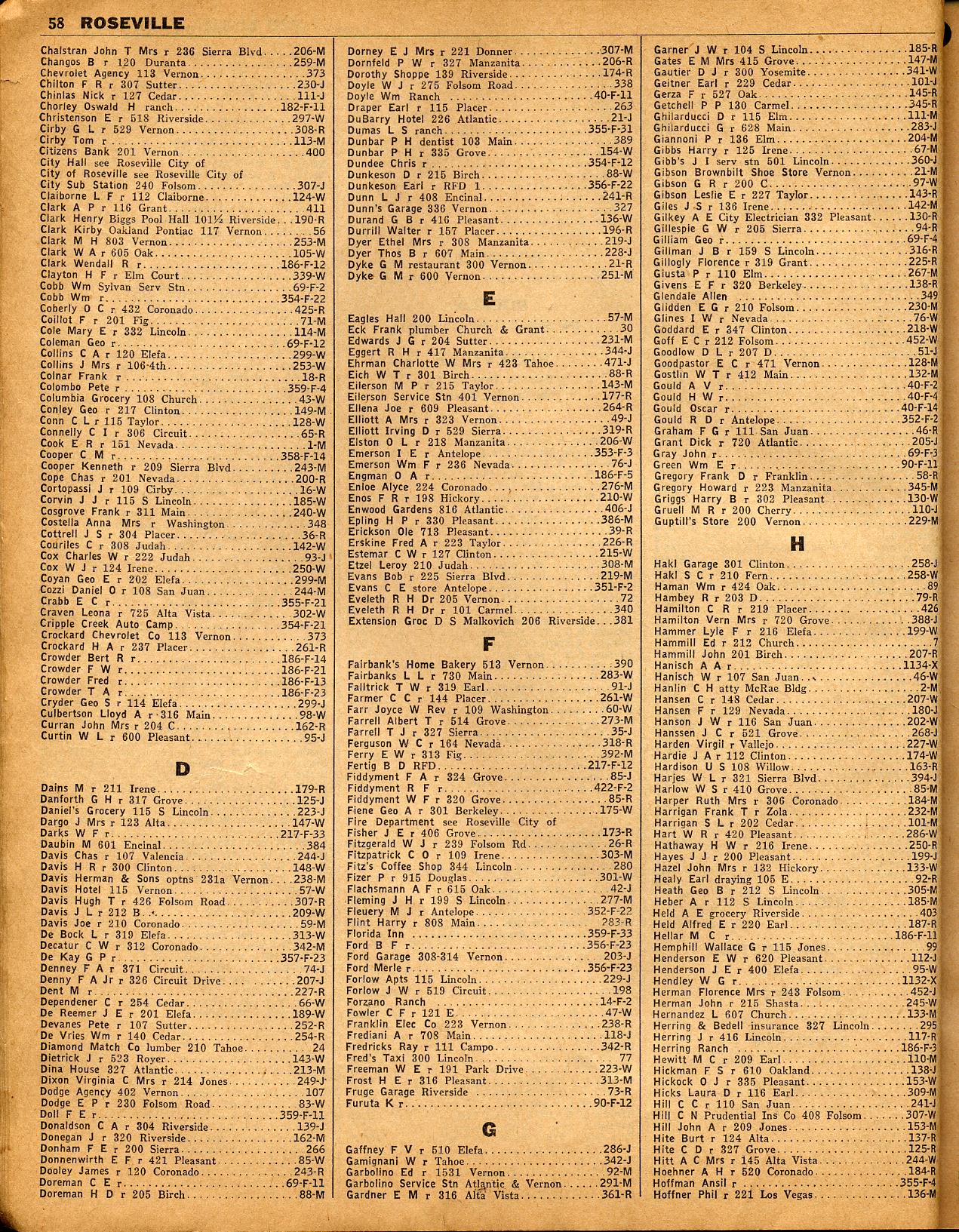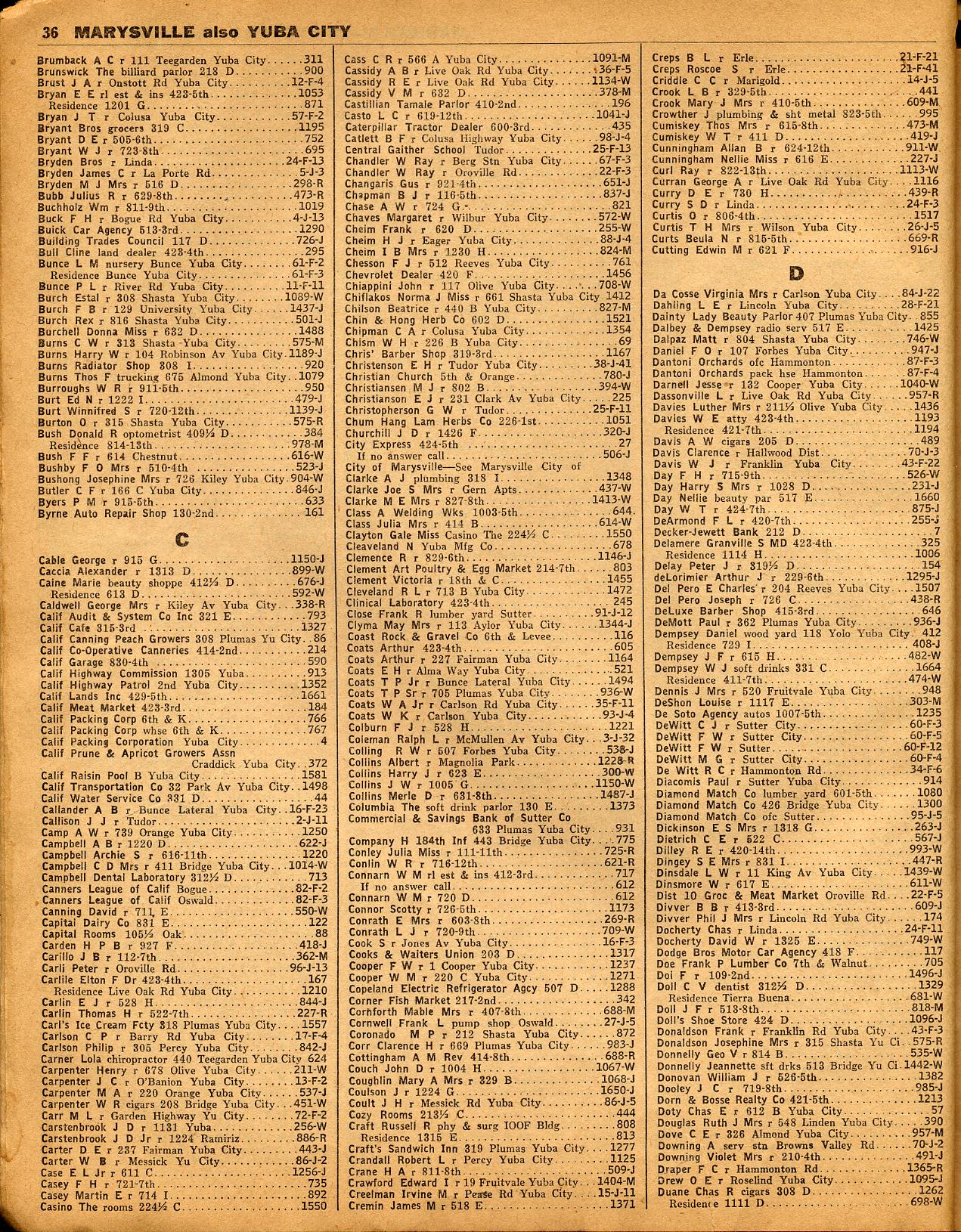 CACHEVILLE, CADANESSA, CALIF HIGHWAY PATROL SCHOOL, CALIME, CAMINO, CAMP RODGERS, CAMP SACRAMENTO, CAMPTONVILLE, CAPAY, CARBONDALE, CARMICHAEL, CEDAR GLEN, CEDARS THE, CELIO, CEMENT, CHALLENGE, CHAMBERS LODGE, CHEROKEE, CHICAGO PARK, CHICO, CHILI GULCH, CISCO, CLARKSBURG, CLARKSVILLE, CLAY, CLIPPER GAP, CLIPPER MILL, COLES STATION, COLFAX, COLLINSVILLE, COLOMA, CONCOW, COOKS STATION, COOL, CORANCO, CORDELIA, COSUMNE, COURTLAND, COUTOLENC, CROWS PEAK, CRYSTAL LAKE & CRYSTAL SPRINGS
