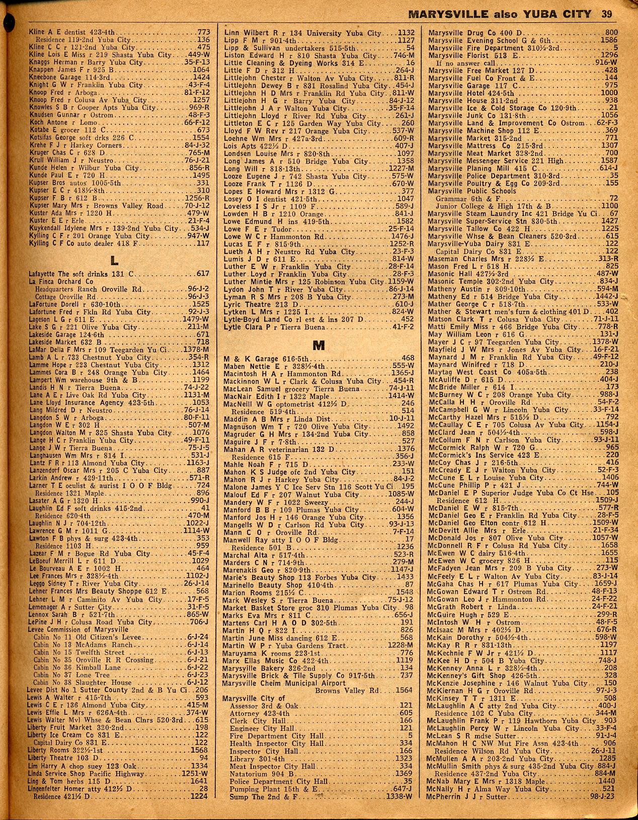 MADISON, MAGALIA, MALAKOFF MINE, MANLOVE, MARIGOLD, MARTELL STATION, MARYVILLE ALSO YUBA CITY, MARYSVILLE CHEIM MUNICIPAL AIRPORT, MATHER AVIATION FIELD, MAYARO LODGE, MAYHEWS, McCRACKEN FIELD, McIVER, McKINNEYS, MERIDIAN, MEYERS, MICHIGAN BAR, MICHIGAN BLUFF, MILLERS FERRY, MILLS, MOKELUMNE HILL, MONTICELLO, MOORETOWN, MORMON ISLAND, MOSQUITO & MULLEN STATION