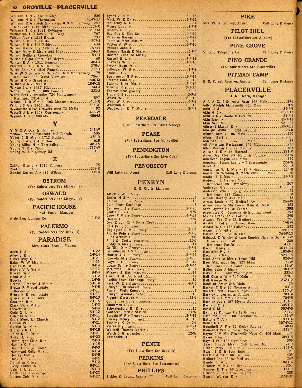 | 47 | | 48 | | 49 | | 50 | | 51 | | 52 |PACIFIC HOUSE, PALERMO, PARADISE, PEARDALE, PEASE, PENNINGTON, PENOBSCOT, PENRYN, PENTZ, PERKINS, PHILLIPS, PIKE, PILOT HILL, PINE GROVE, PINO GRANDE, PITMAN CAMP, PLACERVILLE, PLAINFIELD, PLEASANT GROVE, PLEASANT VALLEY, PLYMOUTH, POLARIS, POMINS, PROUTY, PULGA & PYRAMID CONST CAMP